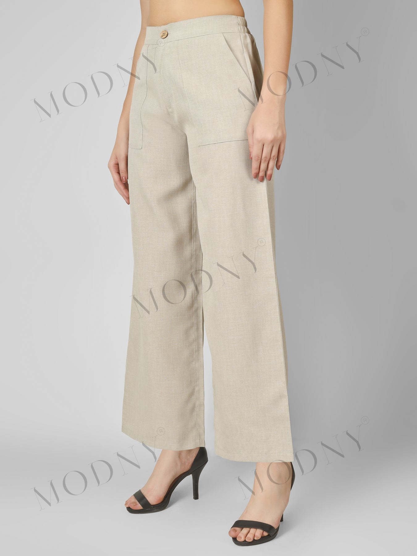 Styling: The model pairs the pants with a white cropped top, black strappy high-heeled sandals, and a small black handbag, demonstrating a modern, elegant, and casual-chic outfit.