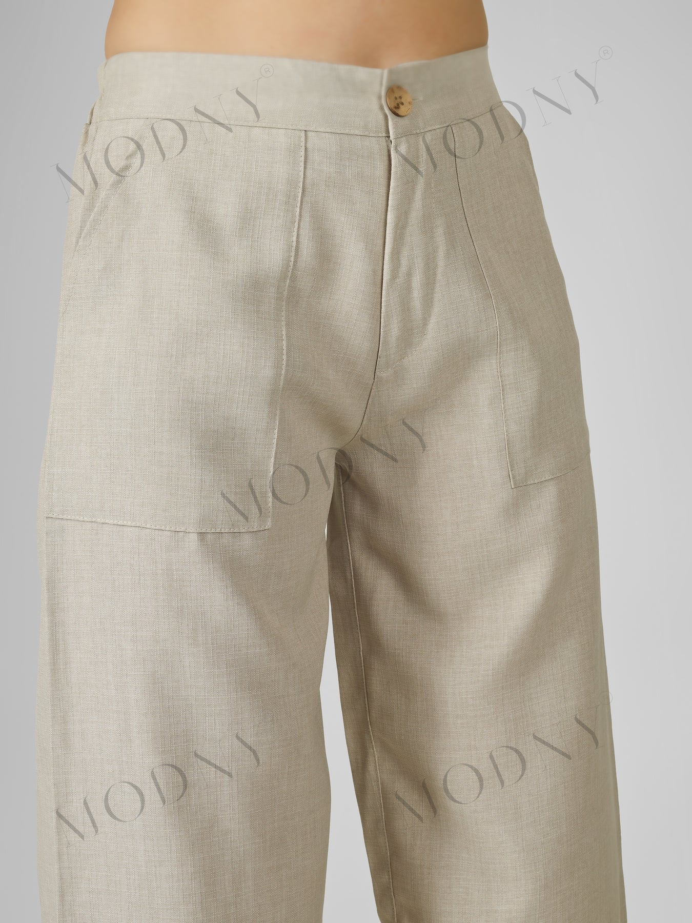 Waistband & Closure: The front boasts a tailored look with a smooth waistband, secured by a single natural wood or coconut button for a touch of organic contrast. The back waistband, as seen in the rear view, appears to be elasticized for a comfortable, flexible fit.