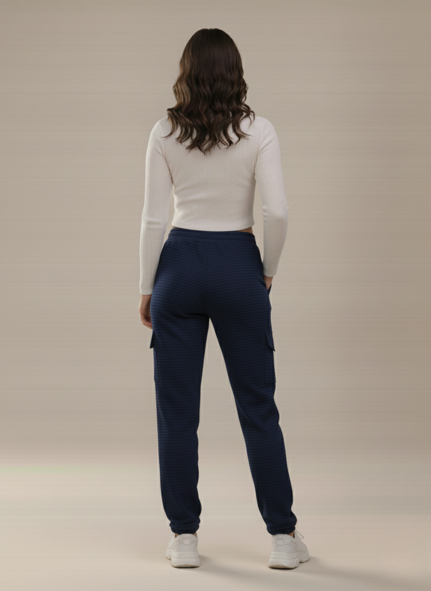 Step up your casual wear game with these exceptionally comfortable and modern joggers. Designed for both relaxation and running errands, these track pants feature a unique all-over textured fabrication that adds a sophisticated touch to the typical casual silhouette. The relaxed, straight-leg fit offers maximum comfort and freedom of movement, while the adjustable drawstring waist ensures a perfect, personalized fit. Practicality meets street style with the addition of functional cargo pockets, providing utility without sacrificing the sleek look. Pair them with a fitted crop top or a loose hoodie for an effortless, on-trend ensemble. These joggers are the perfect foundation for a stylish and comfortable athleisure look.