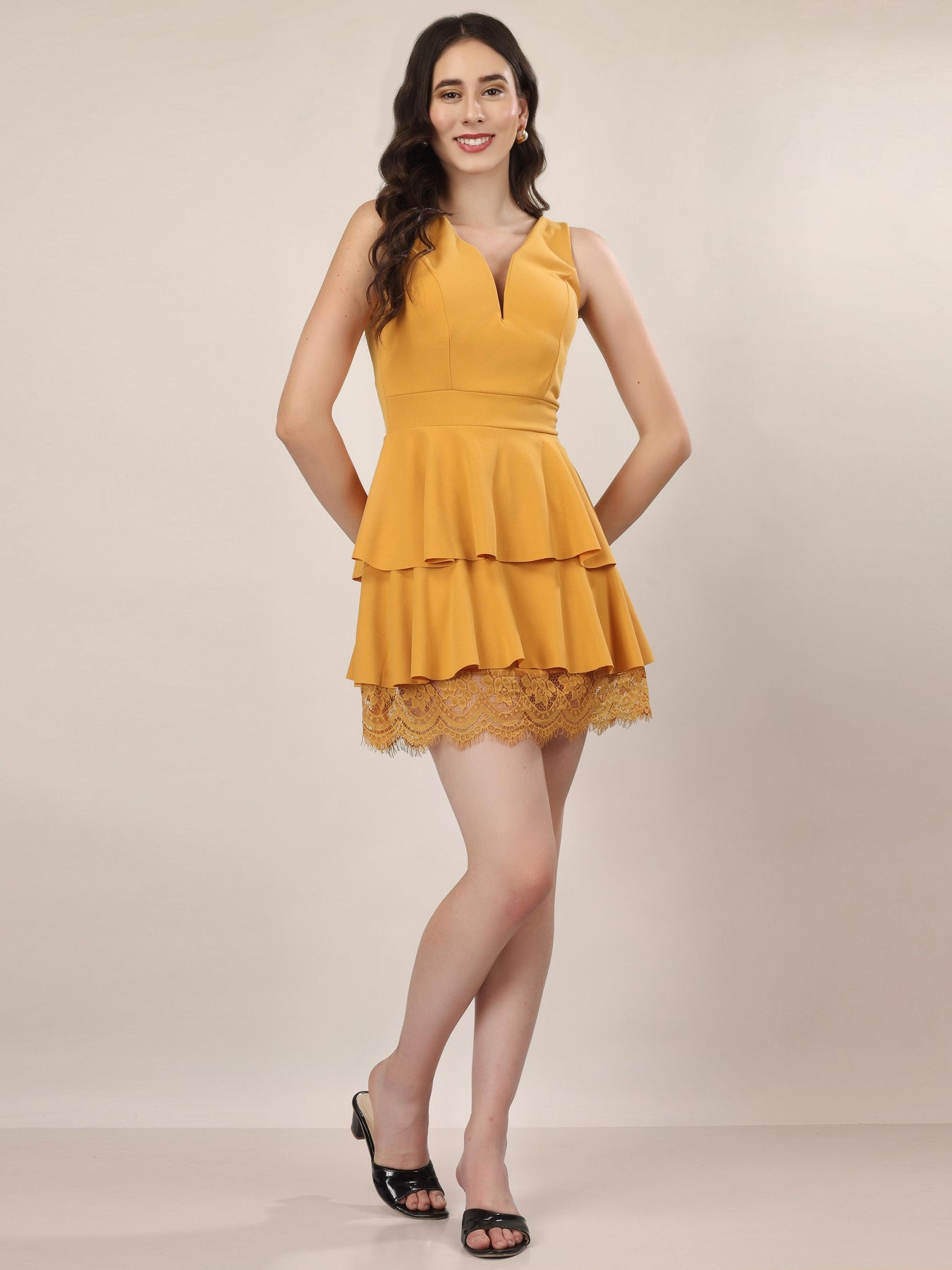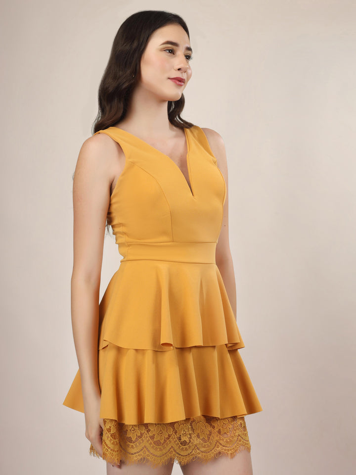 Mustard yellow sleeveless peplum mini dress with a V-neckline and lace hem detail. GOLDEN BLOOM PEPLUM MINI DRESS. Made with scuba crepe, which add a touch of playful elegance to your wardrobe with our Short Frill Dress. Featuring delicate frill detailing, this dress is perfect for creating a feminine, flirty silhouette. Designed with lightweight, flowy fabric, it’s ideal for casual outings, brunches, or special occasions where effortless charm is key.