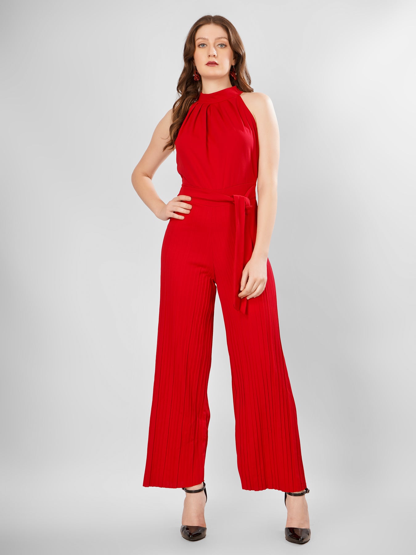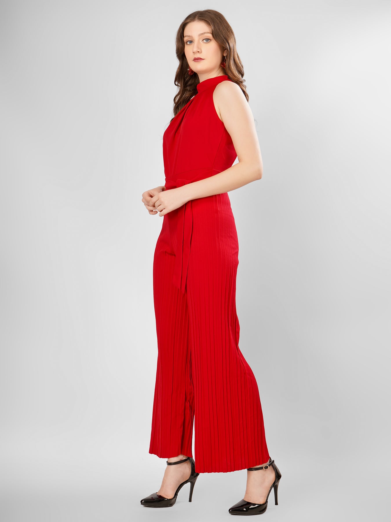 HIGH NECK STYLE JUMPSUIT that flatters every body shape. Neck's high style gives you amaz look, waist adjustable knot makes you comfortable and pleated flared bottom expands and contracts as per the shape of your body, and . This is your perfect outfit for summers, stylish yet breathable. pair it with your favourite high heels for or comfortable shoes and you'll see your summer party look ready!