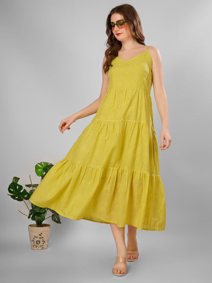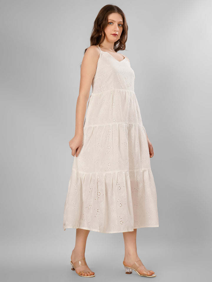 The SCHIFFLI EBROIDERED STRAPPY MIDI DRESS is made from soft cottonfabric. The flattering neckline, and flare gives this dress the perfect soft-girl feminine vibe! The cuts on the dress adds some drama to this fit. It's the perfect vacation outfit - wear it with your favourite flats for a look that will make heads turn. It's also perfect for aday out - put on a pair of heels and you're all set! You'll be so comfortable and so pretty in this dress, you'll never want to take it off! so enjoy with ease.